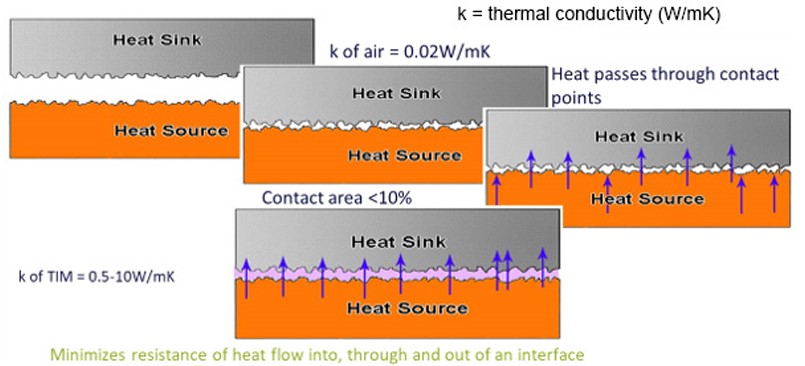 Thermische interface materialen worden soms generiek "gap fillers" genoemd omdat ze kleine luchtgaten tussen bewerkte oppervlakken opvullen, zoals weergegeven in figuur 1. Door een materiaal toe te voegen om gaten tussen bewerkte oppervlakken op te vullen, wordt een pad naar een koellichaam met lage thermische weerstand gecreëerd. Met het juiste thermische interface materiaal, koellichaam en pad voor natuurlijke of geforceerde convectie kan de thermische weerstand van het doelcomponent naar de omgeving worden verminderd.